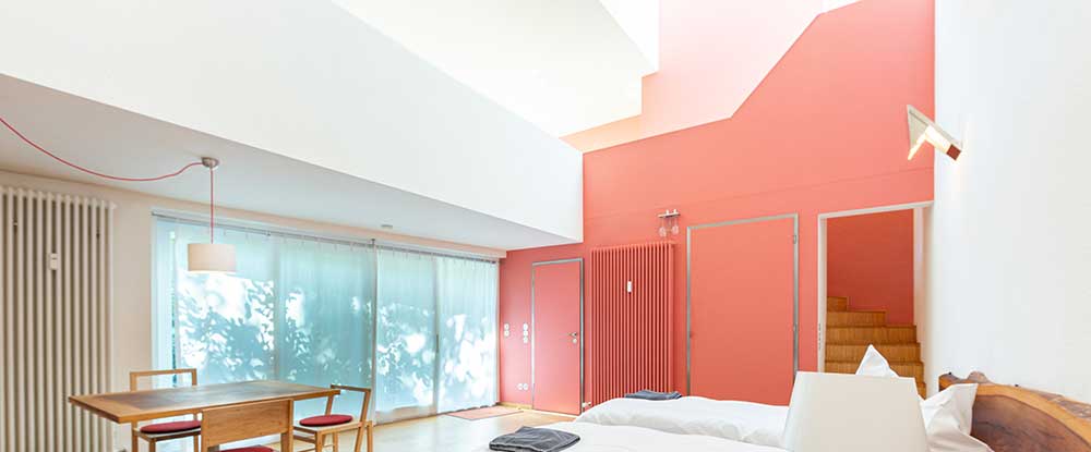 Mit acht Metern Raumhöhe fühlt man sich nicht nur im Bett, vor der höchsten Wand, wie in einer Kathedrale.